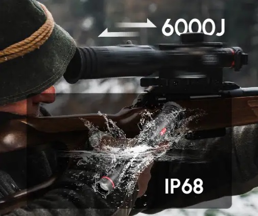 Med tanke på tøffe forhold i felten, er kikkerten ekstra holdbar og solid. Den tåler støt opptil 6000 J for å motstå rekyl, og har IP68 vanntett beskyttelse, som sikrer pålitelig ytelse under alle værforhold.