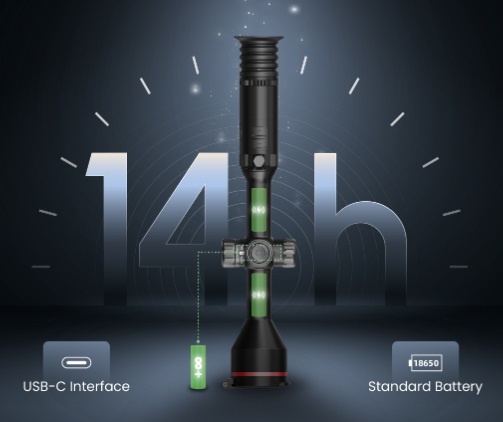 Det doble batterisystemet gir solid strømreserve for lange jaktøkter på opptil 14 timer. I tillegg støtter de utskiftbare standard 18650-batteriene “hot swap”, noe som gjør det mulig med praktisk talt ubegrenset driftstid.