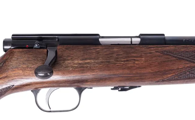 Godt designet, lett og velbalansert og lett skutt. Perlesynte korn foran, sammenleggbart bakre sikt,frest montasje spor og skruehull for montering av skinne, boltaksjon, presisjonsjusterbar dobbelttrekker eller direkte avtrekker med lateral lydløs glidesikkerhet. Godt utformet valnøttbestand med kinnstykke. gummiknapp.